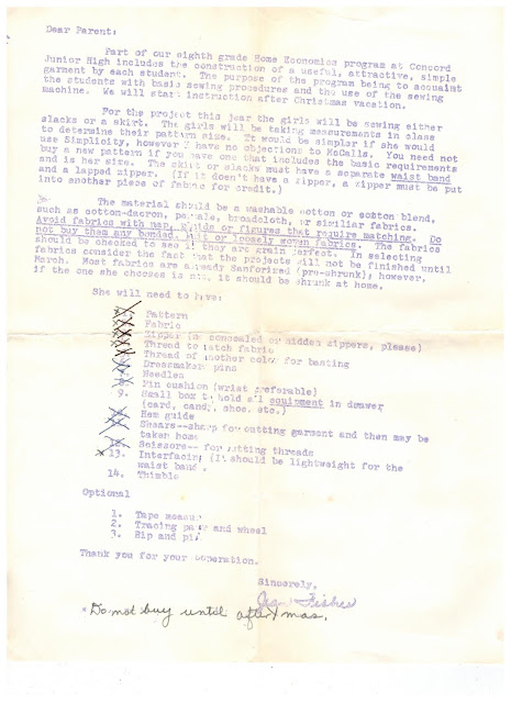 Here are the mimeographed instructions for the sewing lesson, addressed to the parents (because they must pay for the fabric, pattern and other sewing notions). Note that the teacher indicates a preference for Simplicity patterns, but has no objections to McCall's. The teacher requires washable cotton or cotton blend fabric. A full list of needed supplies, including tools, is provided.