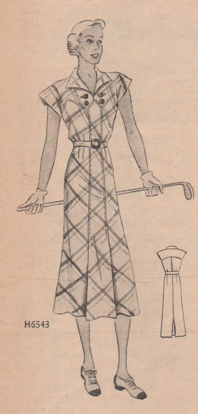 Here is a delightful frock from 1937, apparently the perfect garment for outdoor fun. It appears to be cut on the bias, which always provides graceful flare and movement. I love the top-stitched center box pleat in the skirt front, the shaped yoke with wing revers, and that sporty action back. Wow, did you notice that she is wearing gloves to golf? How professional! :)